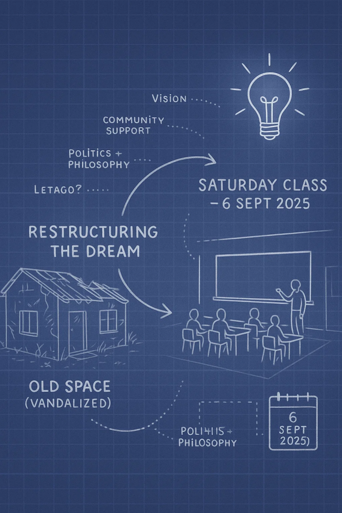 As you all know, our Philosophy classes have stopped for a while now. Short story, we don’t have a place to conduct our classes. The roof has been stolen and the place vandalized, and I am not really eager to fix the place. Without security, “it’s a chasing after the wind,” as Qoheleth would say in the Bible. Oh, and another thing, it is not really our building; it belongs to the government, and it was given to the Phumula Residents Committee, who gave it to us to use. So what should we do in the absence of this desire to fix the place?